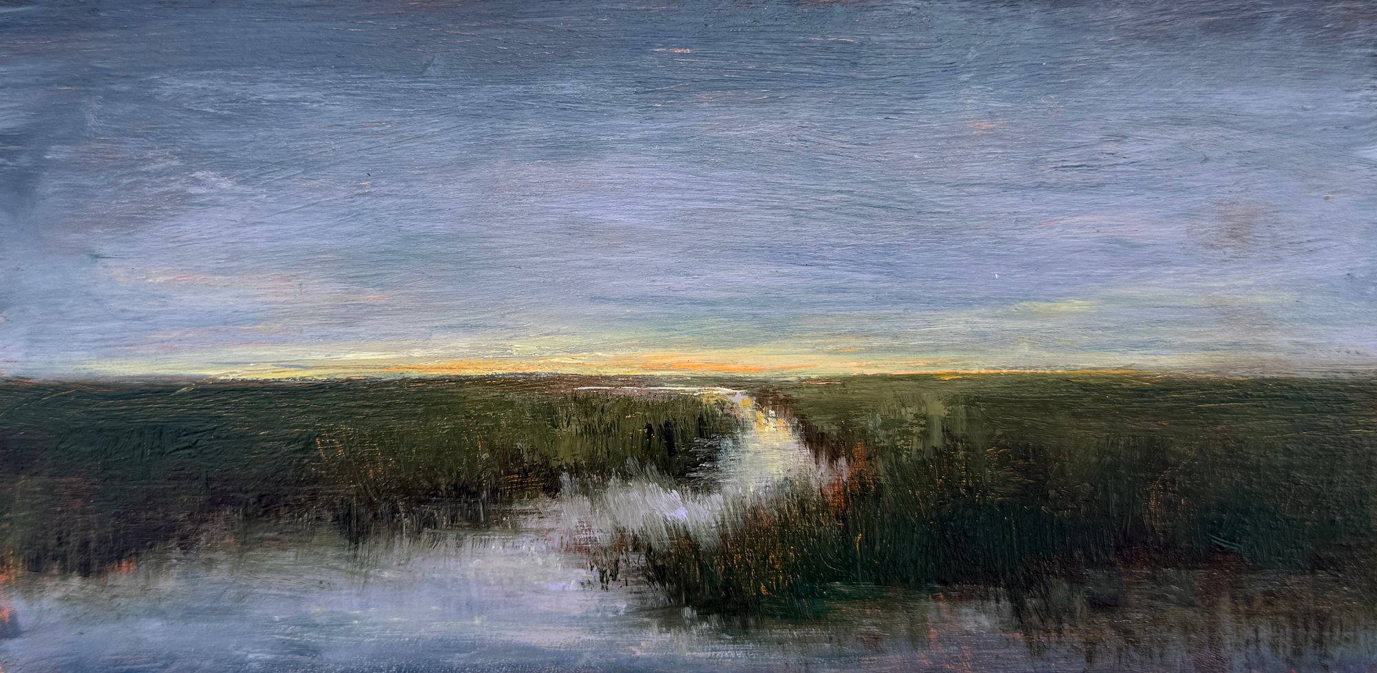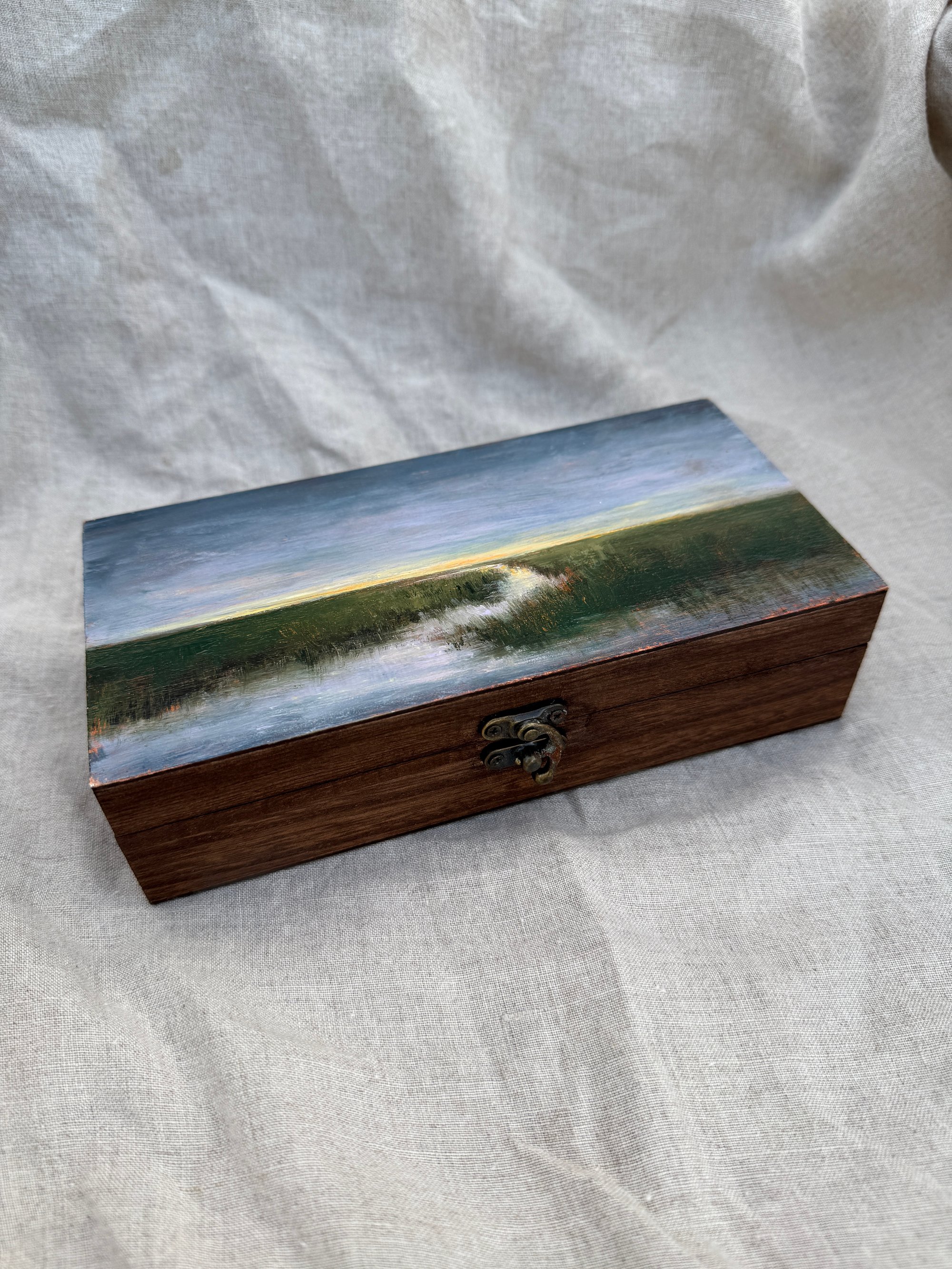 Hand painted wood keepsake box adorned with an original oil painting and finished with a dark walnut stain.