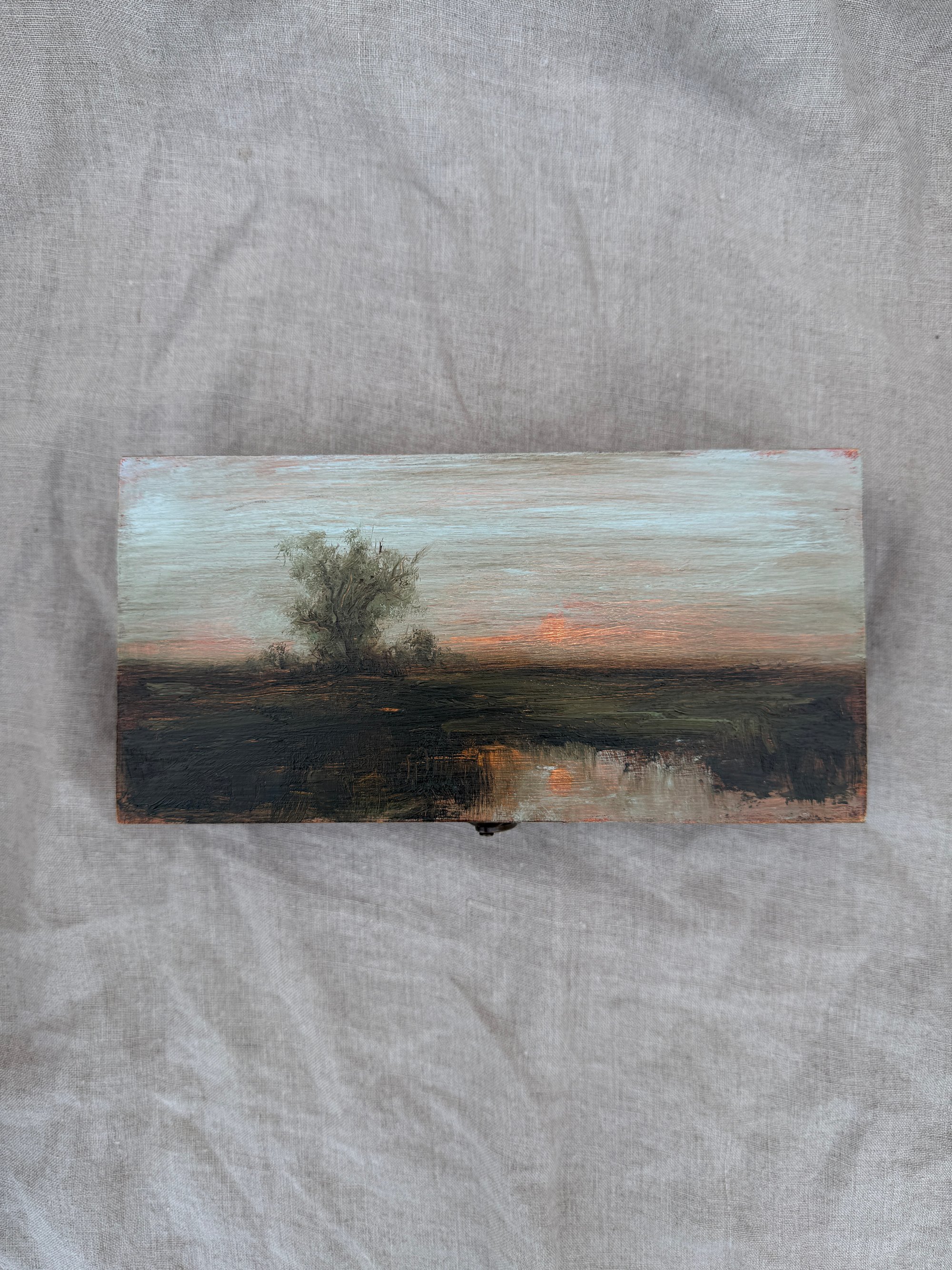 Hand painted wood keepsake box adorned with an original oil painting and finished with a dark walnut stain.